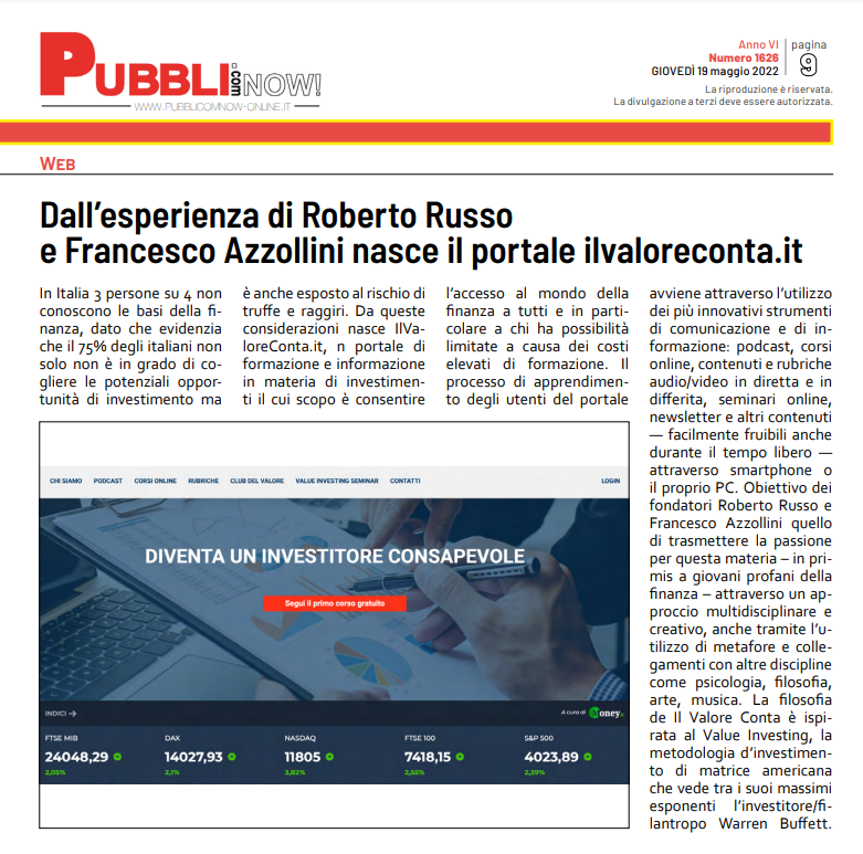 Dall’esperienza di Roberto Russo e Francesco Azzollini nasce il portale ilvaloreconta.it. Il portale d'informazione, formazione ed educazione finanziaria con l'obiettivo di rendere accessibile il mondo degli investimenti a tutti. Ecco l'articolo che il sito Pubblicomnow-online.it ha dedicato al progetto di educazione finanziaria "Il valore conta".