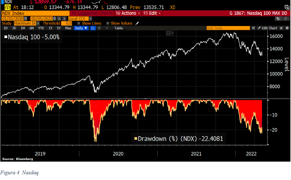 L’impennata dei tassi di interesse causata dalla ripresa dell’inflazione è stata la principale causa che ha dato vita all’inizio di una fase cosiddetta di “mercato Orso” sull’indice azionario americano dei titoli tecnologici Nasdaq Composite, intesa come scostamento percentuale di oltre il 20% dal livello massimo precedentemente raggiunto (si veda grafico successivo).