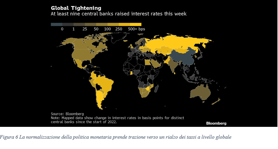 Come si evince dalla figura sopra mostrata, la normalizzazione della politica monetaria prosegue con costanza attraverso una fase di progressivo aumento dei tassi di interesse a livello globale, con la volontà comune delle Banche Centrali di congelare e rallentare l’inflazione.