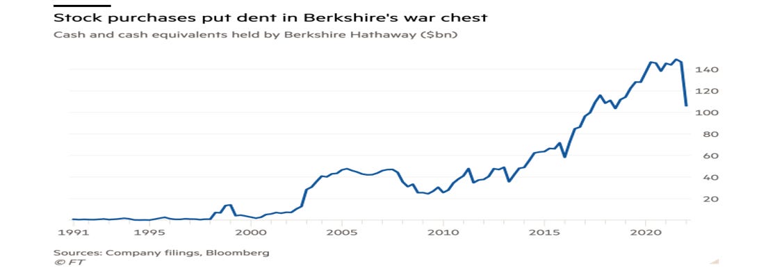 A riprova di quanto affermato, va evidenziato che Berkshire Hathaway, la holding di partecipazione dell’Oracolo di Omaha quotata a Wall Street, nel primo trimestre del 2022 ha investito sul mercato azionario americano oltre 50 miliardi di dollari, come evidenziato nel grafico che segue nel quale è raffigurata l’evoluzione della liquidità detenuta dalla società nell’ultimo trentennio.