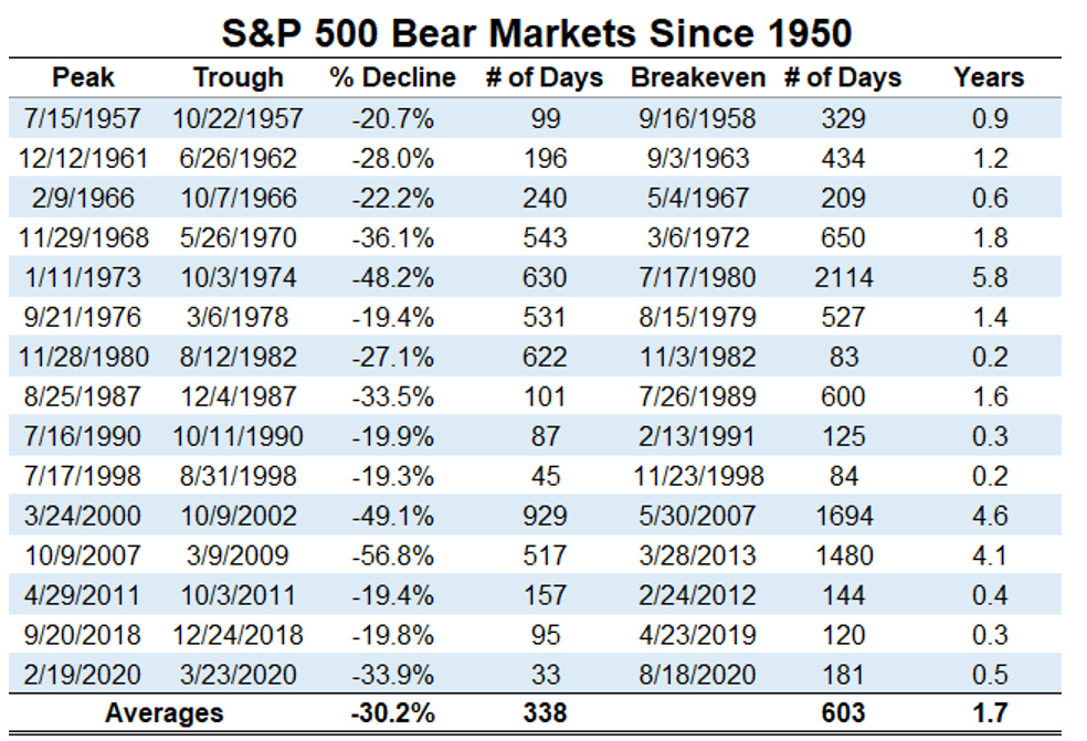 I mercati "Orso" dell'indice S&P500 dal 1950 al 2020