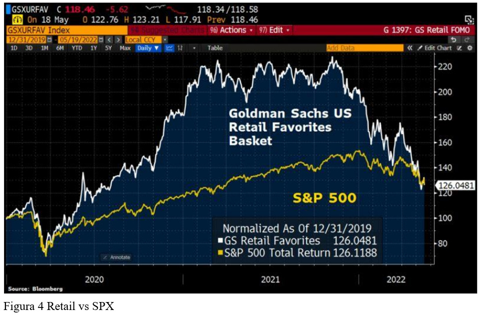 Nel grafico che segue si raffigura l’andamento dell’indice borsistico rappresentativo del comparto retail americano rispetto all’indice S&P 500, nel quale è piuttosto evidente il fenomeno appena descritto.