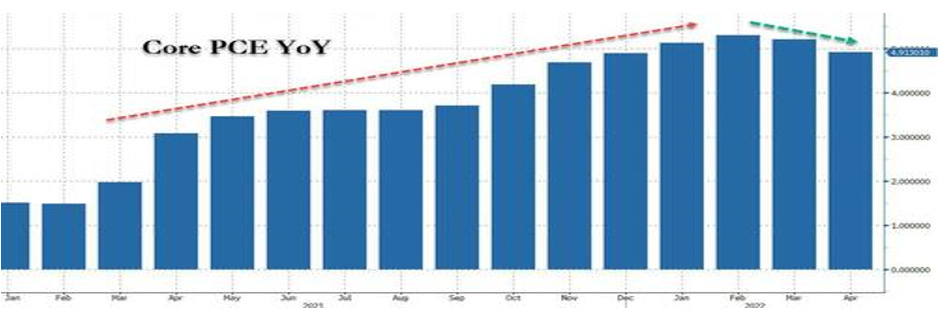 Negli Stati Uniti il dato macroeconomico maggiormente atteso nella scorsa settimana era l’indice “PCE” del mese di aprile, spesso definito anche deflatore PCE, che è un indicatore che misura l’aumento medio dei prezzi per i consumi personali. L’indice è cresciuto del 4,9%, mostrando comunque una tendenza al ribasso rispetto ai due mesi precedenti (si veda la figura che segue).