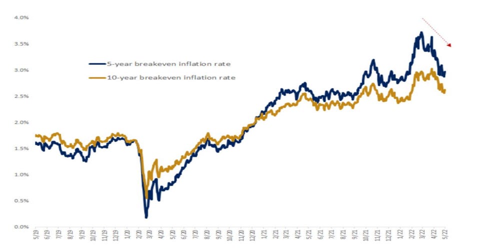 Risulta dunque evidente come le suddette aspettative, dopo avere recentemente registrato un picco, siano repentinamente mutate sulla scia della generale convinzione che la politica monetaria restrittiva (rialzo dei tassi di interesse) inaugurata dalla Federal Reserve e seguita dalle principali banche centrali possa effettivamente favorire un raffreddamento dei prezzi intorno alla soglia del 2%.