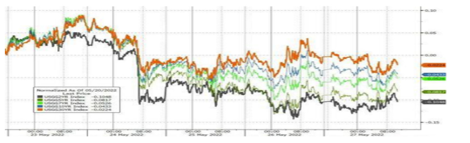 Nell’ultima settimana, unitamente alla riduzione delle aspettative sull’inflazione, abbiamo assistito anche al costante calo dei rendimenti dei titoli governativi statunitensi - particolarmente marcato sulle scadenze più brevi - come evidenziato nella figura che segue: