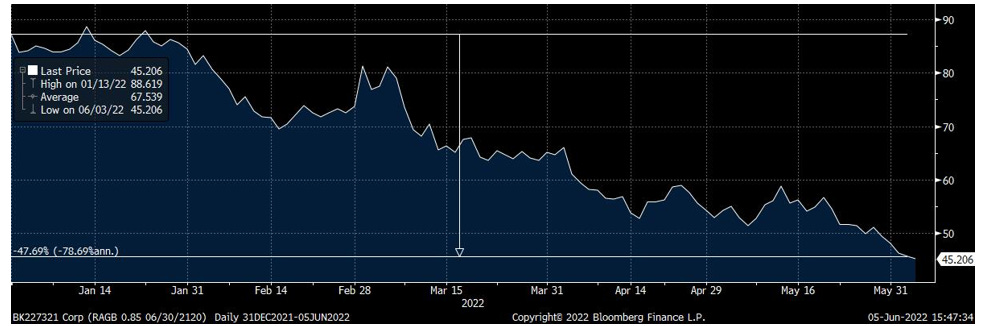 Per meglio comprendere l’impatto negativo sui prezzi dei titoli obbligazionari europei causato dal forte movimento al rialzo dei tassi di interesse e come tale impatto sia direttamente proporzionale all’aumentare delle scadenze dei titoli, mi limito a raffigurare di seguito l’andamento di un titolo di Stato austriaco con scadenza giugno 2120 (cento anni) con cedola annua dello 0,85% emesso nel mese di giugno 2020 alla pari (ovvero al prezzo di 100/100); il suddetto titolo, in seguito al movimento di rialzo dei tassi di interesse che ha interessato l’intero Vecchio Continente, è attualmente negoziato al prezzo di 45/100, che corrisponde a un rendimento composto annuo fino alla scadenza del 2,2%, di cui lo 0,85% derivante dalla componente cedolare e l’1,35% derivante dalla differenza positiva di rendimento tra prezzo attuale (45/100) e prezzo di rimborso a scadenza (100/100) spalmata su 99 anni (tempo residuo).