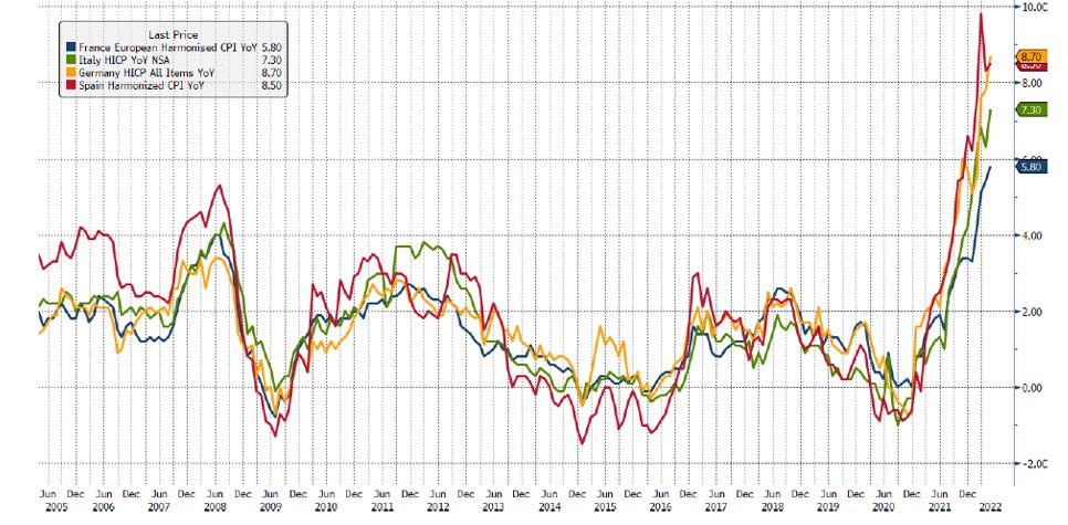 L’inflazione di maggio nell’Eurozona ha registrato una crescita dell’8,1%, un dato superiore rispetto alle attese degli analisti (+7,8%); a livello di singoli Stati è stato raggiunto un picco che non si vedeva dagli anni ottanta (si veda il grafico che segue).
