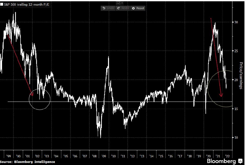 Gli effetti negativi "a cascata" sull'economia globale generati dalla guerra tra Russia e Ucraina sono chiaramente visibili anche nel grafico che segue, nel quale si evidenzia come la compressione del multiplo prezzo/utili (capitalizzazione di borsa/utile netto su base annua) delle società dell'indice borsistico americano S&P500 registrata dai livelli massimi del 2021 sia avvenuta in un terzo dei tempi - e quindi a una velocità tripla - rispetto a quanto sperimentato nei primi anni del 2000.