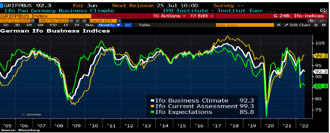 Come anticipato, la settimana appena trascorsa è stata piuttosto scarica di dati sul fronte macroeconomico; in Germania sono stati rispettivamente pubblicati il dato relativo all’indice di giugno dei direttori acquisti del settore dei servizi tedeschi (PMI), risultato inferiore alle aspettative e l’indagine IFO sulla fiducia delle società tedesche, che ha anch’essa disatteso le previsioni degli analisti nelle sue tre componenti: situazione generale, situazione attuale e aspettative (si veda il grafico che segue).