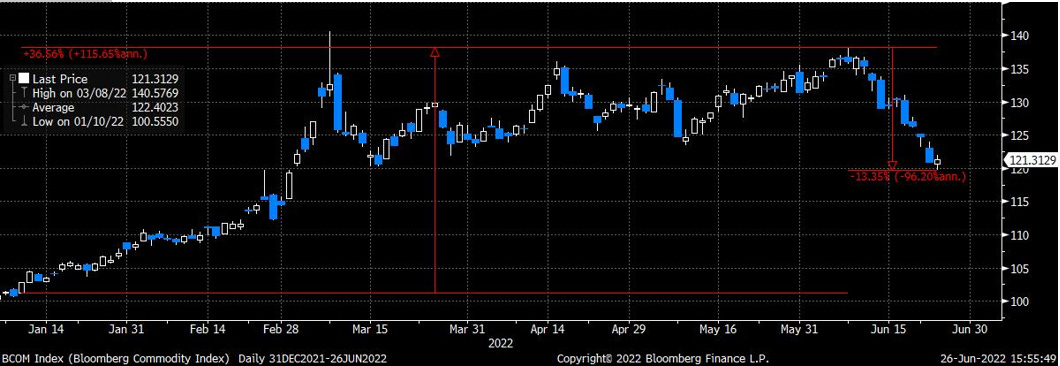 Nella settimana appena trascorsa abbiamo assistito a un generale quanto significativo calo dei prezzi delle materie prime, la cui correzione ha raggiunto circa il 15% dai livelli massimi, come mostrato nel grafico che segue.