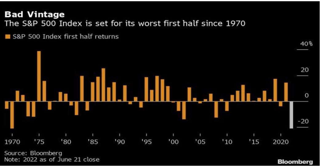 A sole quattro sedute dalla chiusura del primo semestre del 2022, è probabile che l’indice S&P500 chiuda il peggior semestre in termini di performance dal 1970, come raffigurato nel grafico che segue.