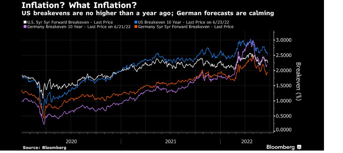 Il complessivo recupero del comparto obbligazionario è stato favorito dalla decisa inversione di tendenza delle aspettative sull’inflazione, come raffigurato nel grafico che segue nel quale sono messe a confronto le aspettative inflazionistiche a 5 anni e a 10 anni rispettivamente in Germania e negli Stati Uniti; come può notare, dopo il forte movimento al rialzo dei primi mesi del 2022, nelle ultime settimane stiamo assistendo a una tendenza ribassista in fase di consolidamento.