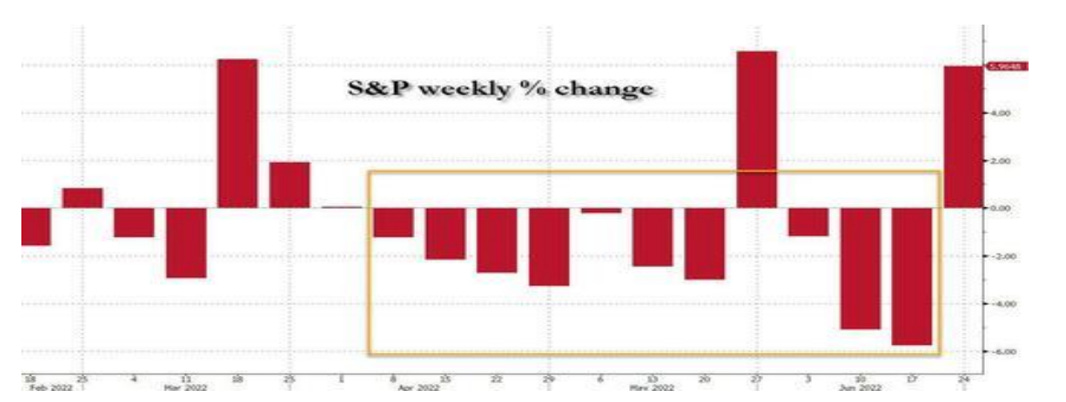 L’indice americano S&P500 ha registrato la seconda migliore performance settimanale del 2022 (si veda il grafico che segue), guadagnando il 6,45%; il Nasdaq Composite ha fatto addirittura meglio, trainato dai titoli a maggiore capitalizzazione, protagonista di un rialzo di oltre 7 punti percentuali.