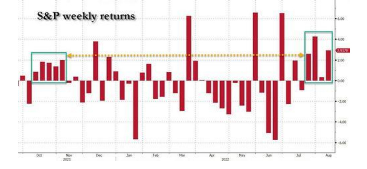 Sui mercati azionari, come sopra rilevato, il dato sull’inflazione americana di luglio ha rappresentato un fattore catalizzatore per il prosieguo del rally, tanto che l’indice S&P500 ha registrato una serie di ben 4 settimane consecutive positive, un evento che non si registrava dallo scorso mese di novembre, come rappresentato nella figura che segue.