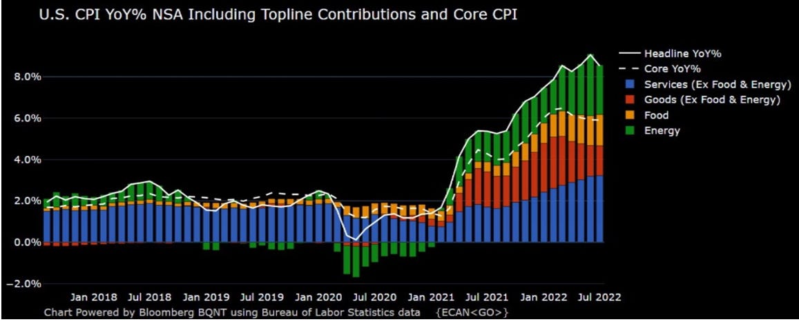 Nel grafico che segue si raffigura l’andamento dell’inflazione americana da gennaio 2018 nelle sue principali componenti.