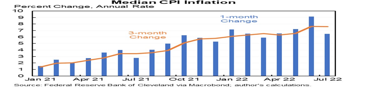 Per avere una lettura più chiara dell’attuale dinamica dell’inflazione americana, di seguito si raffigura il grafico relativo alla cosiddetta “inflazione mediana” il quale è un indice di posizione in quanto è riferito al valore assunto dalla componente che, in ordine crescente di valore, si trova esattamente al centro della distribuzione.