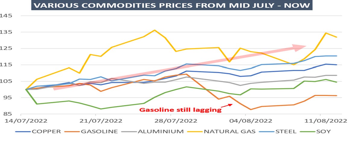 Nel grafico che segue si raffigura l’andamento delle principali materie prime negli ultimi 30 giorni (linea blu: rame; linea rossa: benzina; linea verde: alluminio; linea gialla: gas naturale; linea blu: acciaio; linea verde: soia).