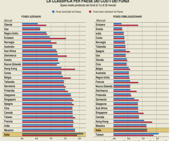 Come sopra evidenziato, l’Italia è all’ultimo posto di questa particolare classifica per ciò che riguarda il comparto azionario, il che vuol dire che gli investitori italiani in media sostengono un costo del 2% circa per sottoscrivere un fondo azionario che, nella maggior parte dei casi, realizzerà una performance inferiore al corrispondente indice di riferimento.