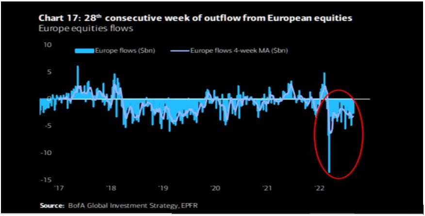 Per quel che riguarda i mercati azionari europei, stiamo assistendo da ben 28 settimane alla costante riduzione dell'esposizione dei fondi alle azioni del Vecchio Continente, come evidenziato nel grafico che segue.