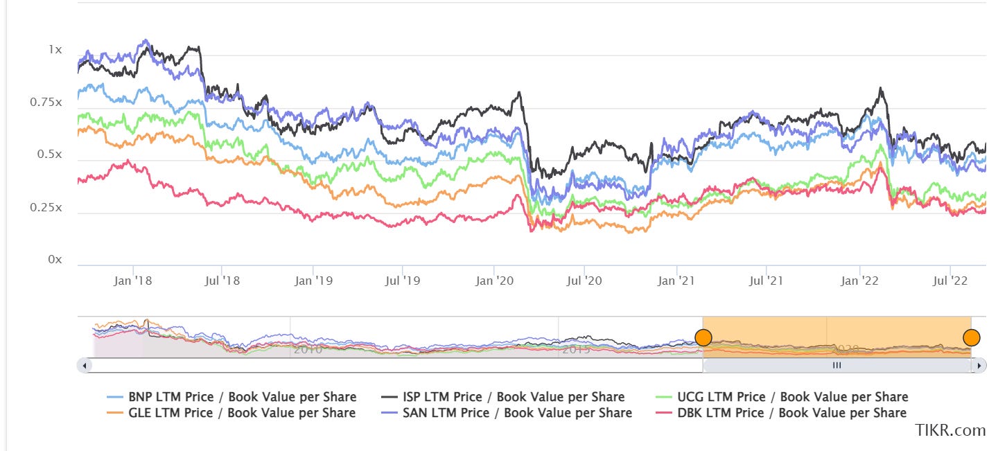 Nel grafico che segue raffiguriamo l’evoluzione del multiplo Capitalizzazione di mercato/Patrimonio netto delle principali banche europee dal 2018 a oggi dal quale si evince l’attuale grado di sottovalutazione dell’intero comparto (linea nera: Intesa Sanpaolo; linea viola: Banco Santander; linea azzurra: BNP Paribas; linea verde: Unicredit; linea arancione: Societe Generale; linea rossa: Deutsche Bank).