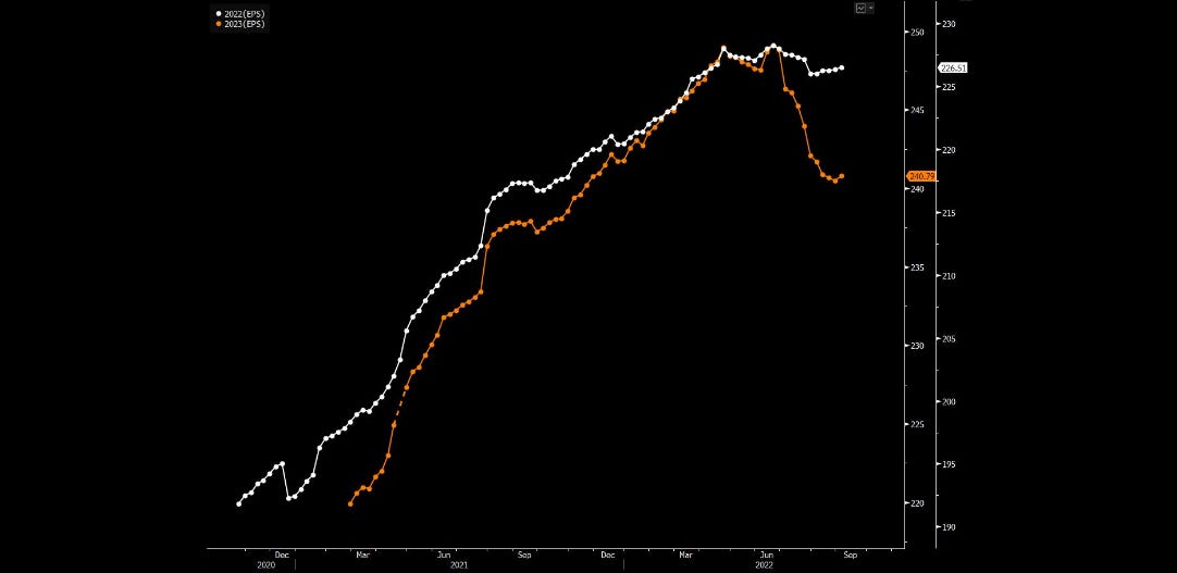 Concludo la newsletter con un segnale di fiducia, mostrando di seguito il grafico del dato relativo alla stima dell’utile per azione medio delle società che compongono l’indice S&P500 rispettivamente nel 2022 (linea bianca) e nel 2023 (linea arancione).