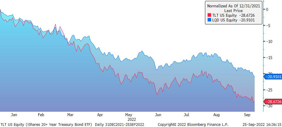 A conferma della debacle del settore obbligazionario nell’anno in corso, mostriamo di seguito i grafici di due ETF americani: l’LQD, che traccia l’andamento delle obbligazioni reputate più “sicure” (cosiddette “investment grade”) e il TLT, che sintetizza l’andamento dei titoli di Stato americani con scadenza media superiore a 10 anni. I due ETF perdono da inizio anno rispettivamente il 21% e il 29% circa.