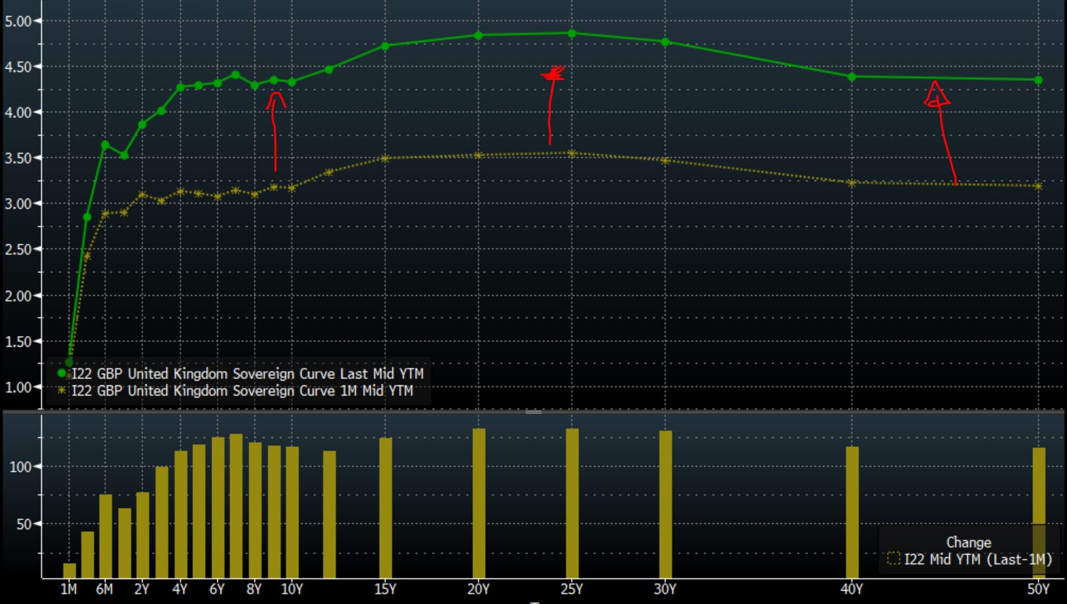Curva dei tassi del Regno Unito rispettivamente oggi (linea verde) e un mese fa (linea gialla)