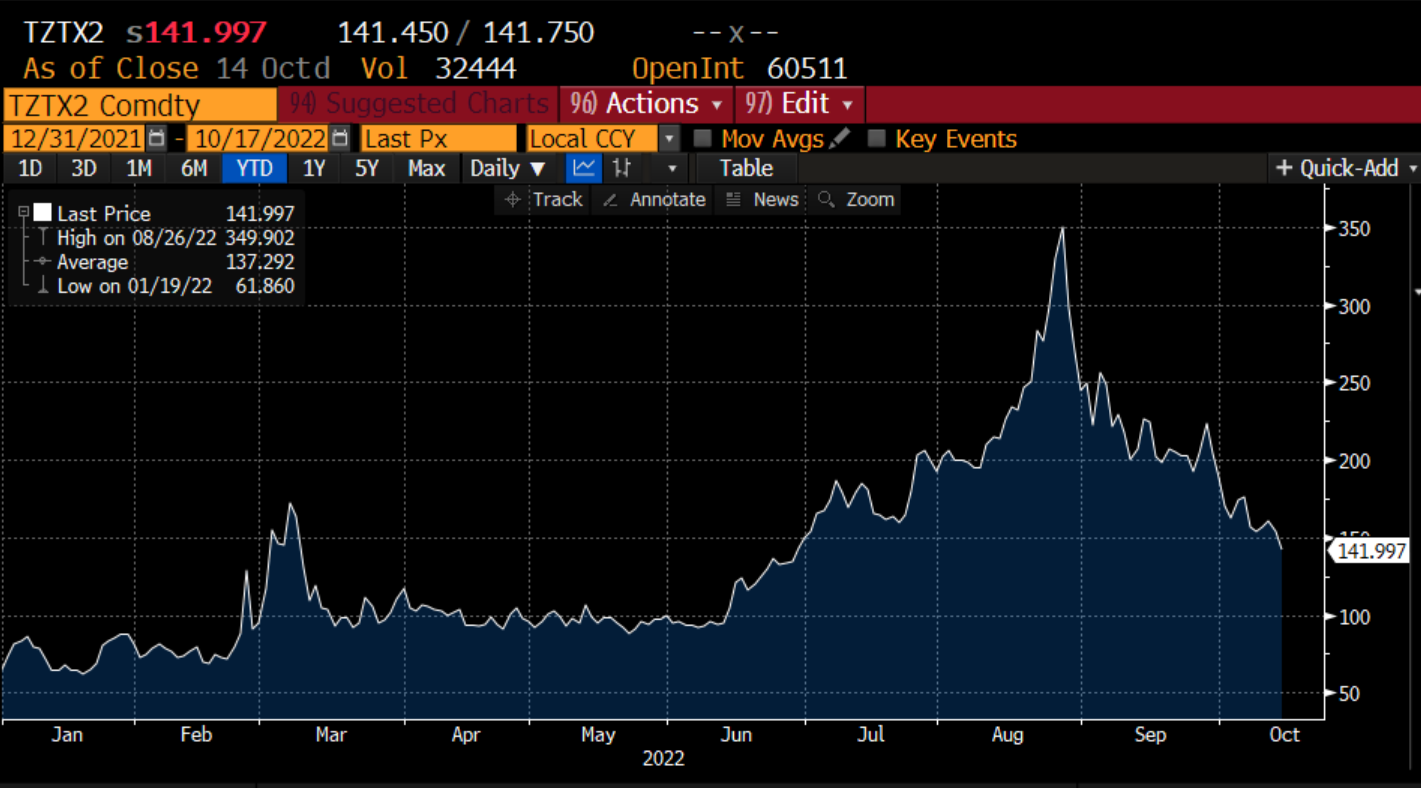 Il trend ribassista inaugurato nel mese di settembre riflette da un lato le aspettative su un possibile accordo sul tetto al prezzo del gas russo da parte dei paesi dell'Unione Europea e dall'altro la speranza che finalmente si possa intraprendere la via del negoziato sul fronte del conflitto tra Russia e Ucraina.
