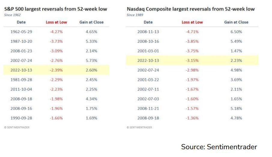 Dal punto di vista statistico, la seduta del 13 ottobre è stata rispettivamente la quarta e la quinta seduta nella storia degli indici americani Nasdaq Composite e S&P500 in termini di oscillazione massima giornaliera, come di seguito raffigurato: