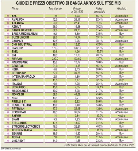 Nella figura che segue emerge come numerose azioni che compongono l’indice borsistico FTSEMIB40 presentino un forte margine di sconto rispetto al prezzo obiettivo indicato dagli analisti di Banca Akros.