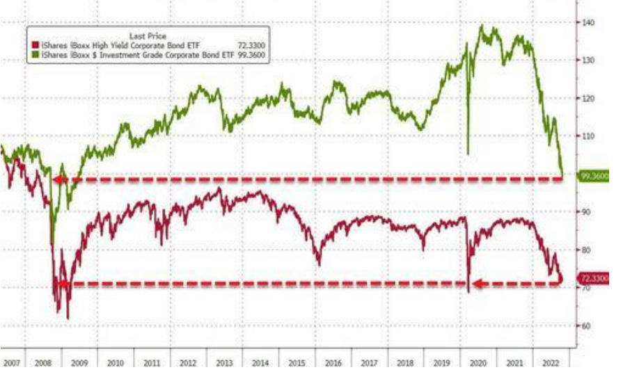 Sempre negli Stati Uniti prosegue il trend rialzista dei tassi di interesse sui mutui, mentre anche i rendimenti sulle obbligazioni societarie sia a basso rischio (“investment grade”) che a rischio elevato (“high yield”) registrano nuovi massimi, come evidenziato nel grafico che segue nel quale si evidenzia il livello di deprezzamento dei suddetti titoli tornati ai valori minimi degli ultimi 15 anni.