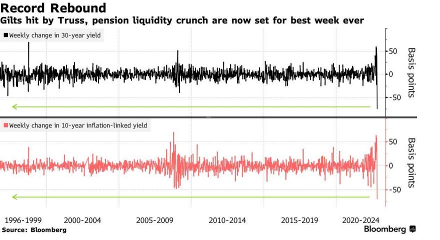 I titoli di Stato britannici hanno realizzato la migliore settimana di sempre in seguito alla notizia delle dimissioni della Truss, con i rendimenti in fortissimo calo in particolare sulla parte a lungo termine della curva dei tassi, come evidenziato nei grafici di seguito raffigurati che mostrano le oscillazioni su base settimanale dei rendimenti delle obbligazioni governative britanniche con scadenza trentennale (in nero) e decennale (in rosso).