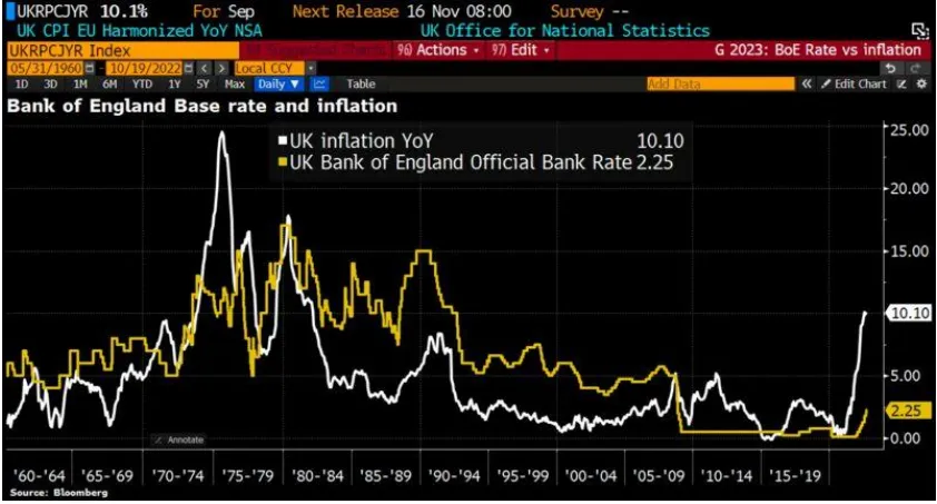 La politica britannica sta dunque superando per distacco quella italiana dell’ultimo ventennio in termini di incoerenza e di incapacità di eleggere un Governo stabile e duraturo. Nel frattempo i giornali locali si arricchiscono grazie alla pubblicazione di copertine e articoli provocatori, mentre i cittadini britannici subiscono le drammatiche conseguenze di una crescente pressione fiscale e dell’ascesa dell’inflazione che, come di seguito raffigurato, nell’ultimo mese di settembre ha registrato una crescita del 10,1% su base annua (+14% dei prezzi dei beni alimentari) toccando il massimo degli ultimi 40 anni.