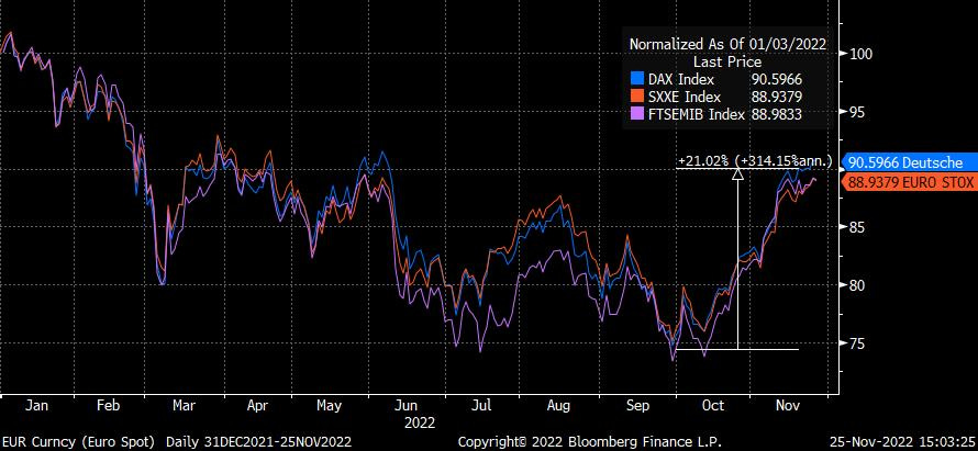 Tuttavia i dati macro della Germania della scorsa settimana, che hanno evidenziato la ripresa della fiducia delle imprese e un forte calo dei prezzi alla produzione nel mese di ottobre, fanno crescere le probabilità che in Europa il picco dell’inflazione sia molto vicino.