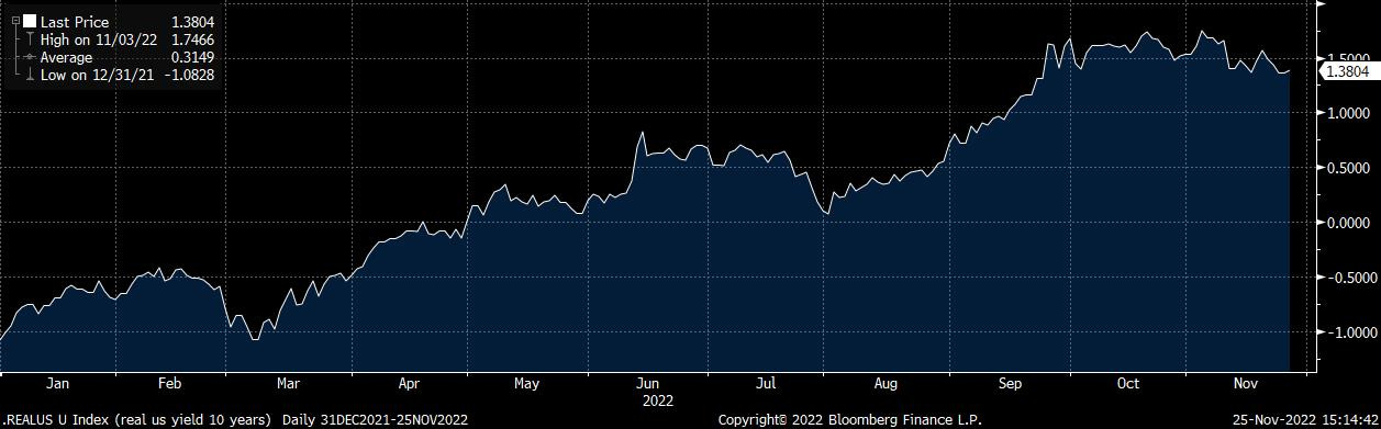 Nel grafico che segue si raffigura l’andamento del tasso reale (rendimento al netto dell’inflazione) dei titoli governativi statunitensi con scadenza decennale che nelle ultime tre settimane è passato dall’1,8% all’1,38%, un trend che rafforza le aspettative sulla fine del ciclo di rialzi dei tassi da parte della Federal Reserve entro il primo trimestre del 2023.