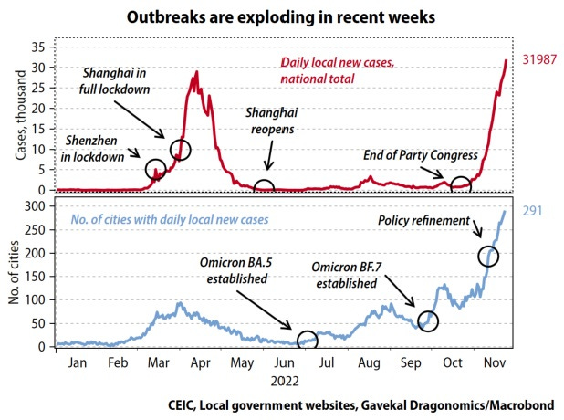 L’indebolimento del dollaro ha favorito l’apprezzamento dei metalli preziosi che hanno complessivamente registrato rendimenti positivi nel corso dell’ultima settimana; viceversa, il petrolio ha lasciato sul campo il 3% sui timori di un potenziale calo della domanda a causa dell’improvviso aumento dei casi di Covid in Cina dove numerose città sono ritornate in regime di lockdown, come raffigurato nei due grafici che seguono dove si evidenzia il recente trend di crescita dei nuovi contagi (linea rossa) e del numero di città in regime di lockdown (linea blu).