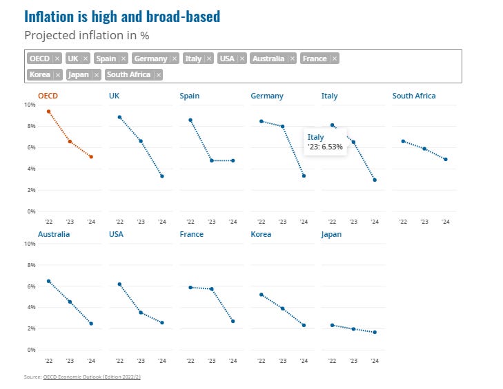 La scorsa settimana l’Organizzazione per la Cooperazione e lo Sviluppo economico (Ocse) ha pubblicato l’aggiornamento delle prospettive economiche globali, presentando uno scenario di rallentamento della crescita mondiale nel 2023 e nel 2024 escludendo però lo scenario recessivo.