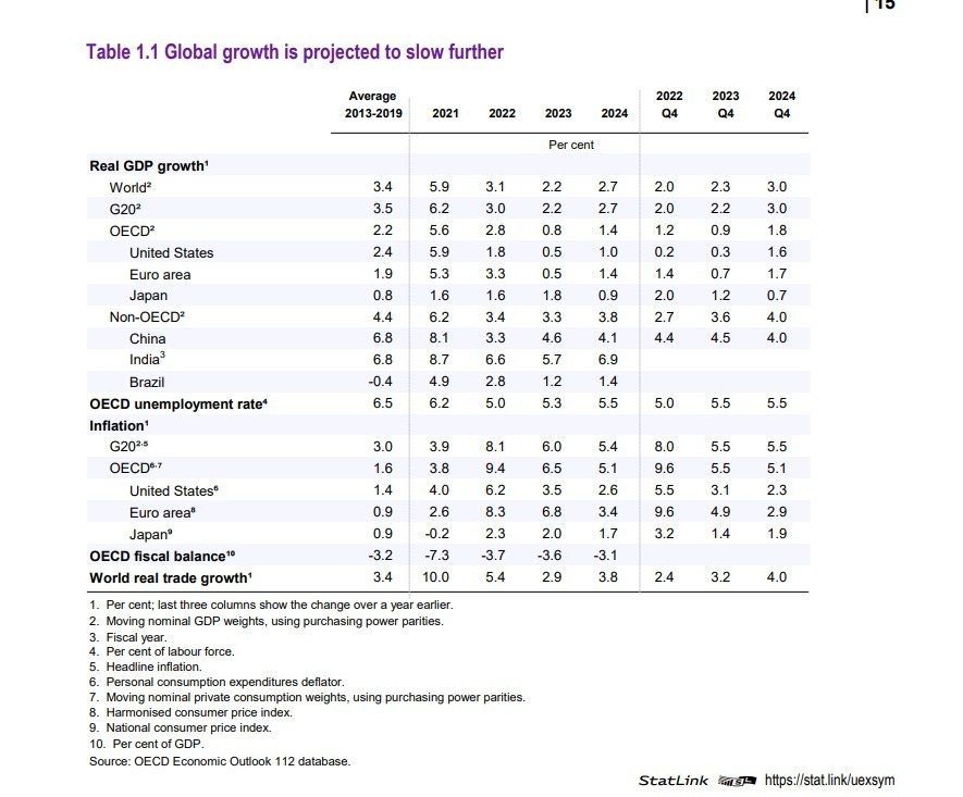 L’Ocse stima che la crescita del Pil globale del 2022 si attesterà al 3,1%, per poi scendere al 2,2% nel 2023 e rimbalzare al 2,7% nel 2024.