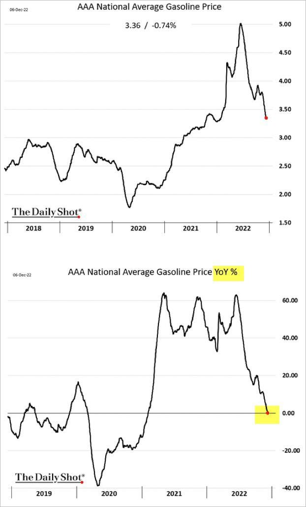 Al calo del prezzo del petrolio ha fatto seguito quello del prezzo della benzina negli Stati Uniti, anch’esso tornato ai livelli di inizio anno sotto 3,5 dollari al gallone, come evidenziato nel grafico che segue.
