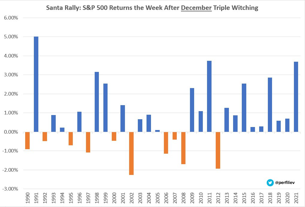 Fatta questa doverosa premessa, chiudo la newsletter come spesso faccio con un messaggio di ottimismo, mostrando l’andamento dell’indice S&P500 dal 1990 a oggi nella settimana successiva al giorno delle “tre streghe” del mese di dicembre di ciascun anno.