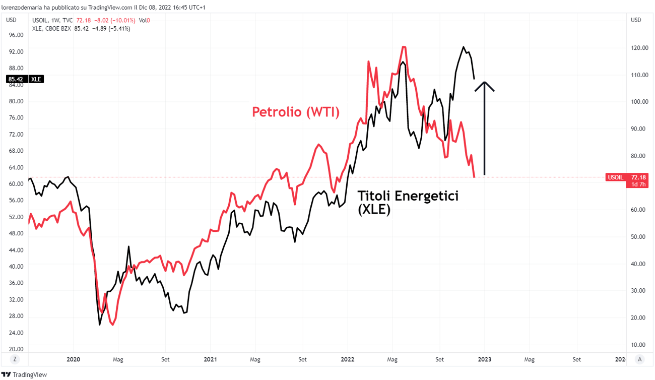 Il grafico che segue mette a confronto il prezzo del petrolio con l’ETF “XLE” - un certificato rappresentativo dei principali titoli del settore energetico - dal 2020 a oggi.