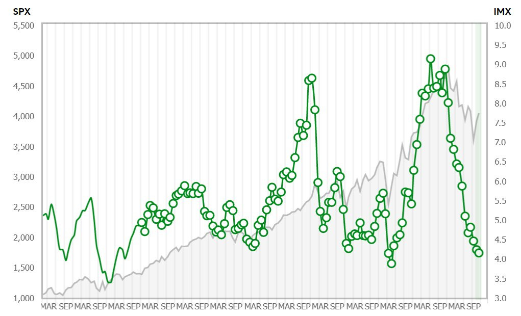 Nel riquadro che segue sono rappresentati rispettivamente l’andamento dell’indice S&P500 (linea grigia, asse delle ordinate a sinistra) e quello dell’indice IMX (linea verde, asse delle ordinate a destra).
