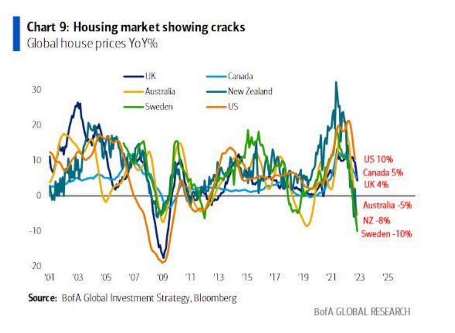 Sempre in riferimento al mercato immobiliare, segnalo di seguito un grafico molto interessante dal quale si evince come il trend di riduzione dei prezzi delle case dai livelli massimi raggiunti nel 2021 stia interessando un numero sempre maggiore di paesi.