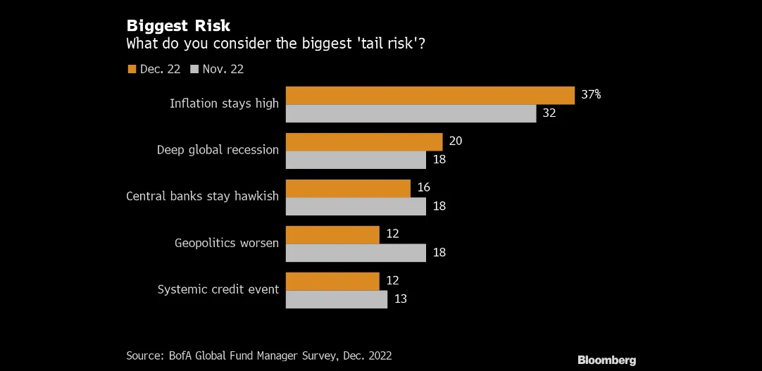Nella figura che segue si riassumono i principali fattori di rischio emersi dall’indagine di Bank of America effettuata rispettivamente nei mesi di novembre e dicembre 2022.