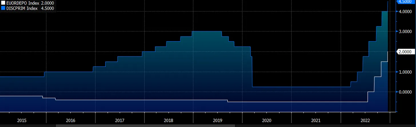 Allo stato attuale i tassi sono rispettivamente pari al 2% (BCE) e al 4,5% (Fed).