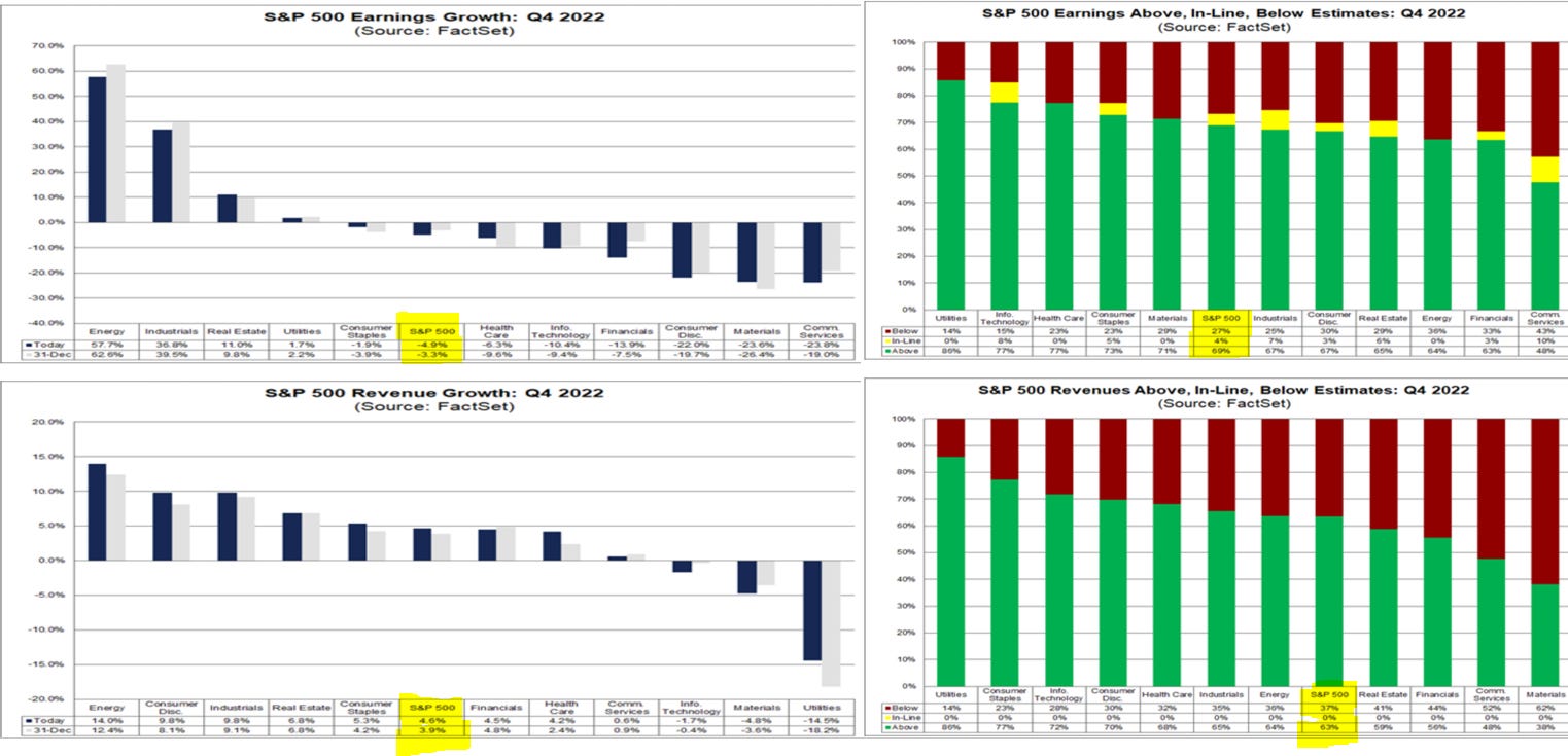 Finora l’utile per azione delle società dell'indice S&P500 che hanno presentato i dati trimestrali è risultato in media in calo del 4,9% rispetto al corrispondente periodo dell’anno precedente, mentre il fatturato è cresciuto in media del 5% circa, come raffigurato nei grafici che seguono: