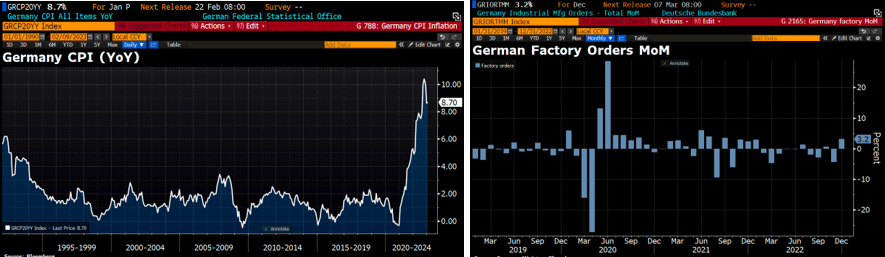 In una settimana caratterizzata da pochi dati macroeconomici di rilievo i riflettori erano puntati sulla Germania, con il dato sull’inflazione preliminare che è risultato leggermente inferiore alle attese (+8,7%) e il dato sugli ordinativi delle fabbriche risultato in crescita (+3,2%), i quali hanno fornito una conferma della tenuta dell’economia tedesca (si vedano i grafici che seguono).