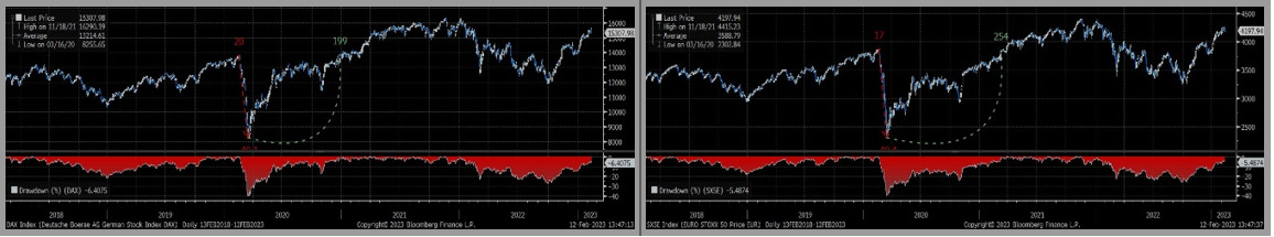 Il clima di fondo positivo è confermato dalla circostanza che gli indici Dax ed Eurostoxx50 sono a pochi punti percentuali dai massimi storici, come raffigurato nei due grafici che seguono.