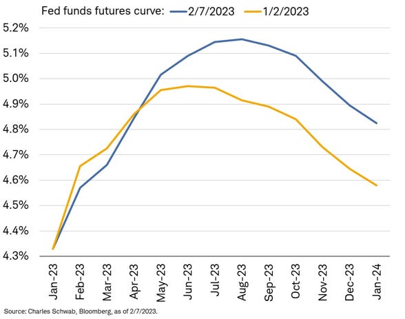 Di seguito si raffigura il grafico delle aspettative sul futuro andamento dei tassi della Fed, con gli analisti che hanno rivisto leggermente al rialzo e spostato di qualche mese in avanti il raggiungimento del tasso neutrale (ovvero il tasso antecedente l’inversione del ciclo di politica monetaria da restrittiva a espansiva) atteso adesso sopra il 5% nel mese di agosto 2023.