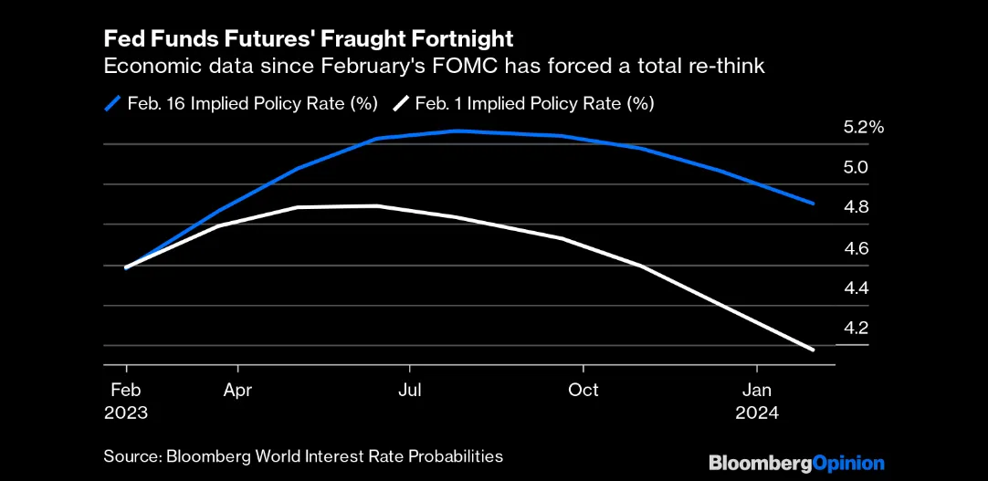 Di seguito si rappresenta il grafico delle aspettative degli analisti sul futuro andamento dei tassi della Fed fino al primo trimestre del 2024 rispettivamente al 1 febbraio (linea bianca) e al 16 febbraio (linea blu).